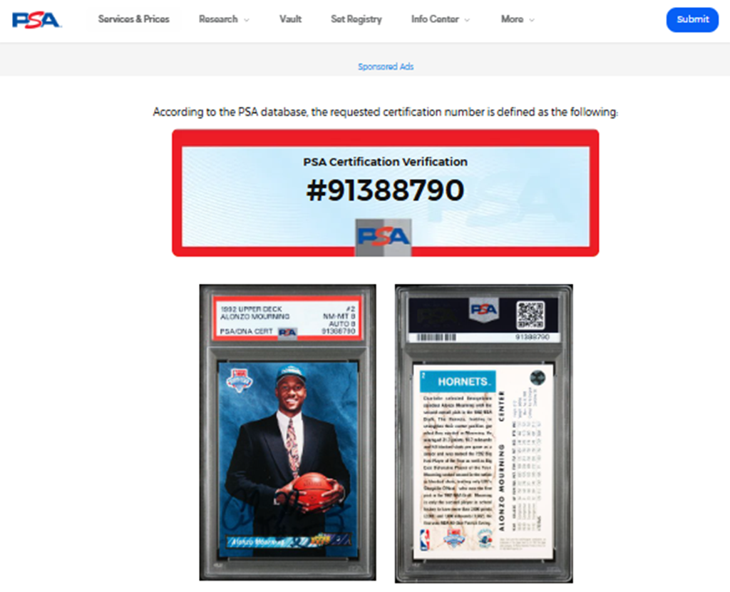 Tarjeta autografiada por Alonzo Mourning autenticada por PSA 91388790.
