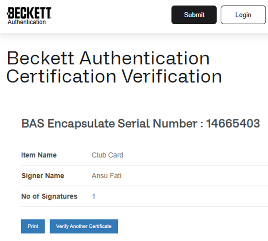 Firma certficada por una de las empresas más grandes y reconocidas de la industria Beckett Authentication Services.