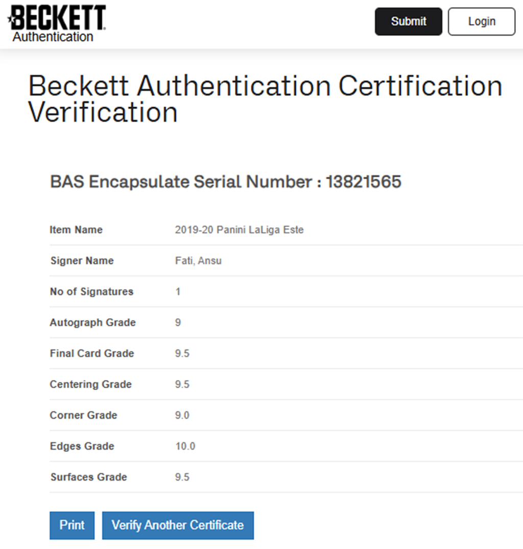 Autógrafo certificado por Beckett con calidad 9 y tarjeta con calidad Gem Mint 9.5.