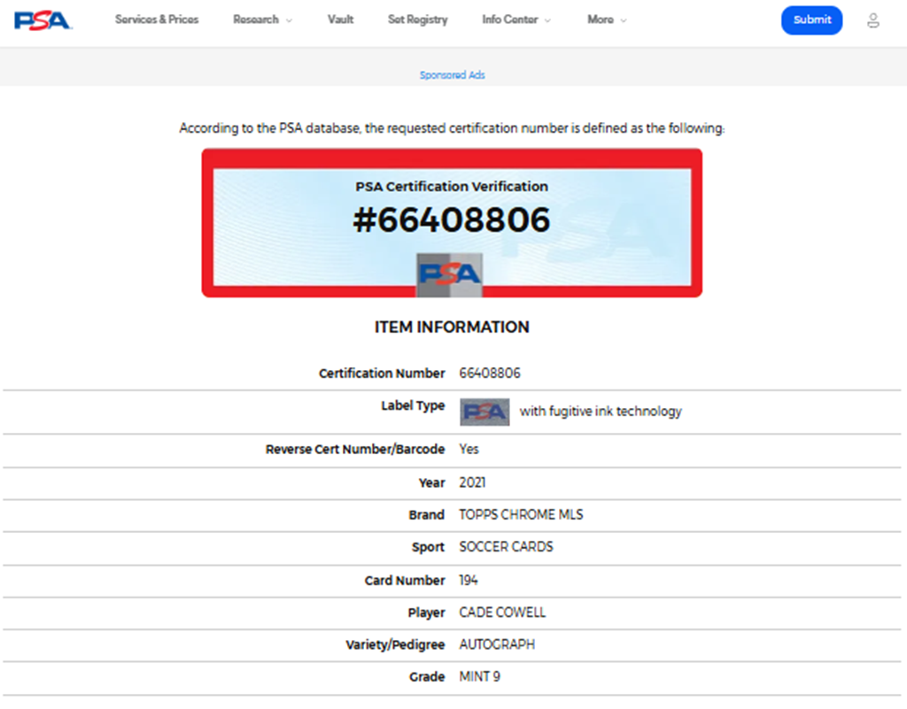 Firma certificada por PSA, es la empresa de autenticación y clasificación de terceros más grande y respetada del mundo para tarjetas coleccionables y recuerdos.