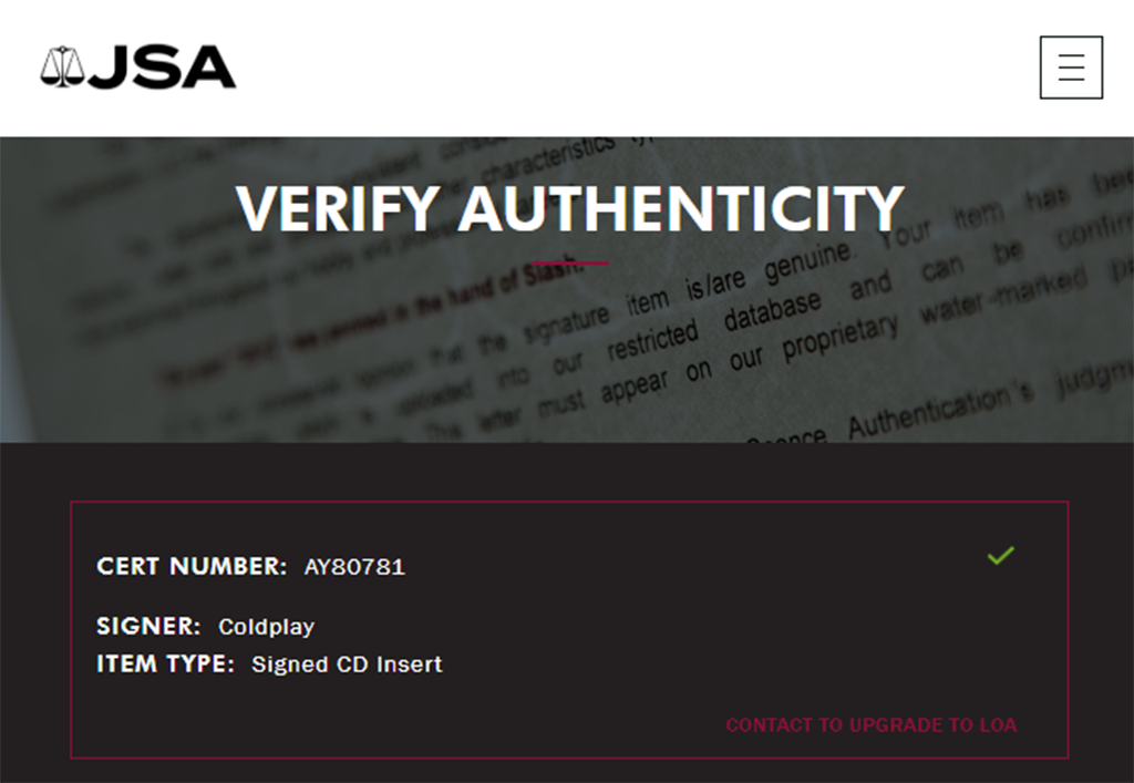 Autógrafos certificados por la compañía JSA, cada CD viene con diferente certificado y calcomanía que autentifica las firmas JSA AY80781 y AY80868.