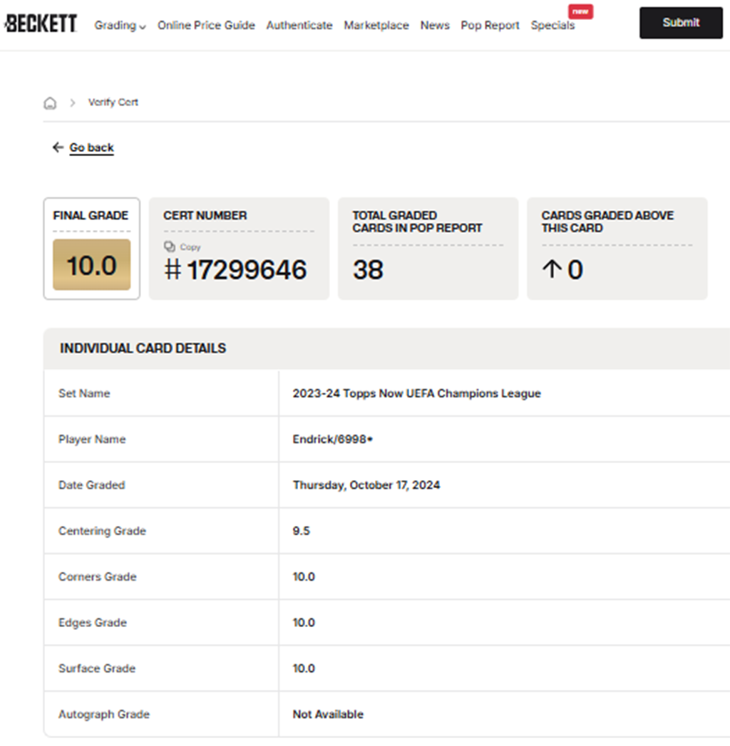 Endrick Felipe tarjeta Topps Now Certifica Beckett 0017299646.