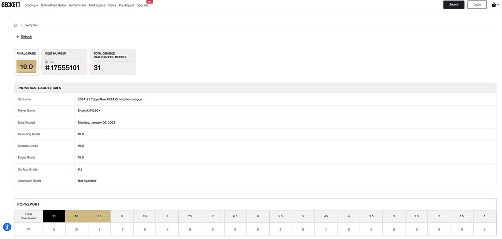 Tarjeta 2024-25 Topps Now UCL graduada con calificación Pristine 10.