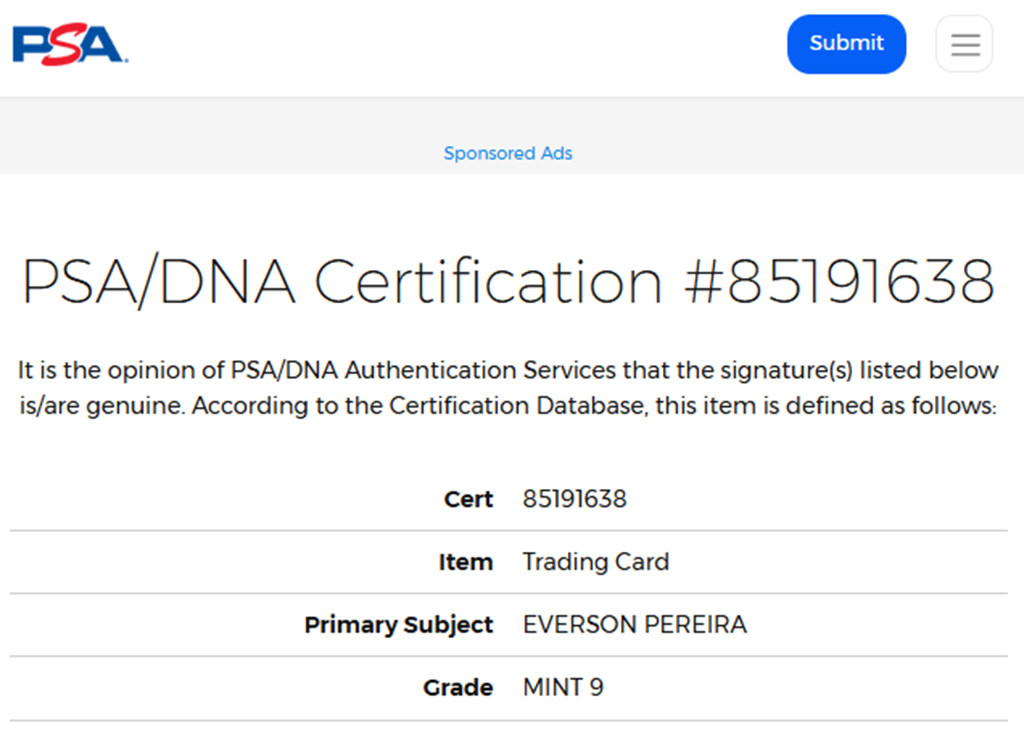 Firma certificada por PSA, es la empresa de autenticación y clasificación de terceros más grande y respetada del mundo para tarjetas coleccionables y recuerdos.