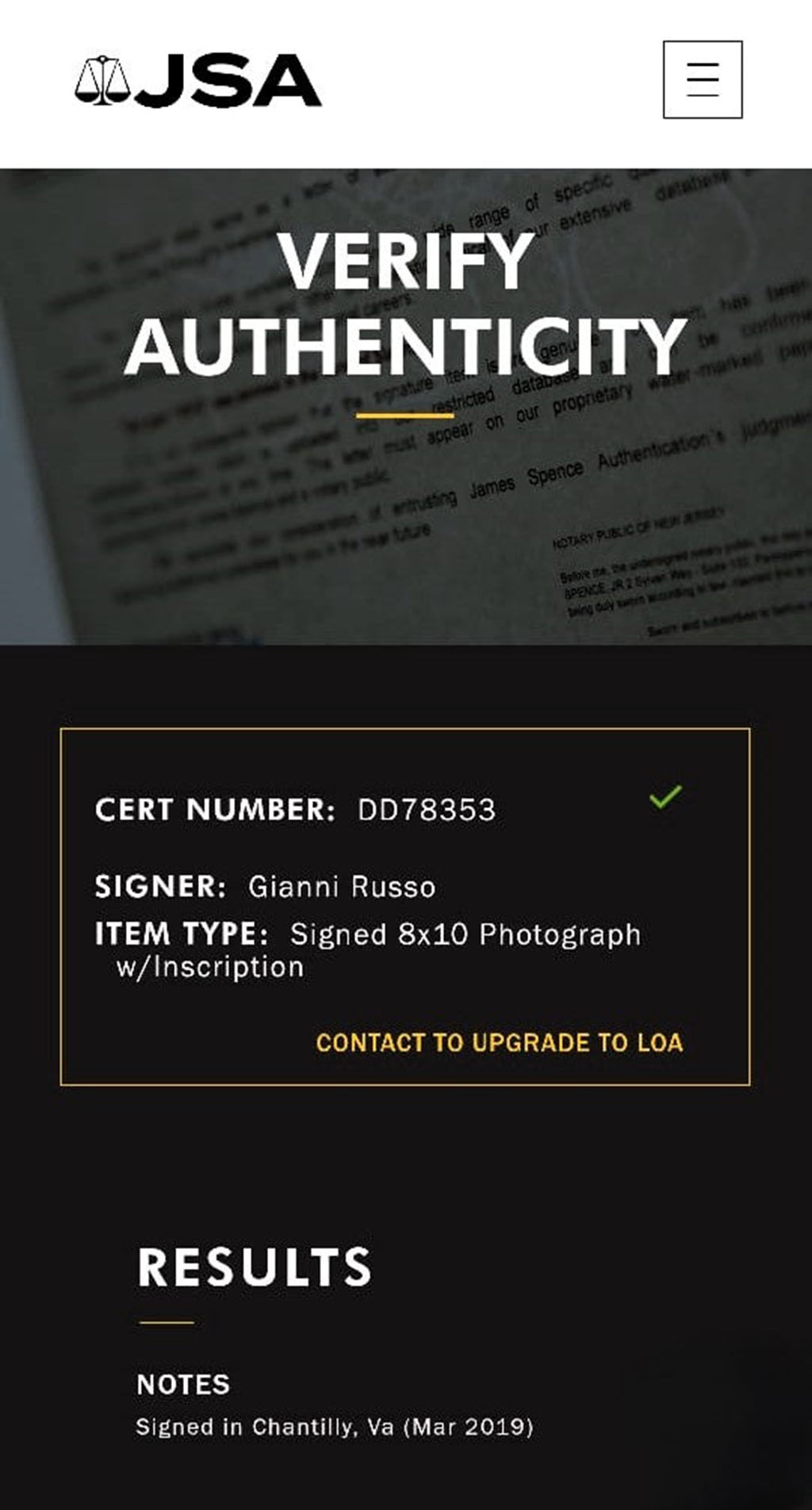 Gianni Russo “Carlos Rizzi El Padrino” Fotografía Autografiada firma certificada por JSA DD78353