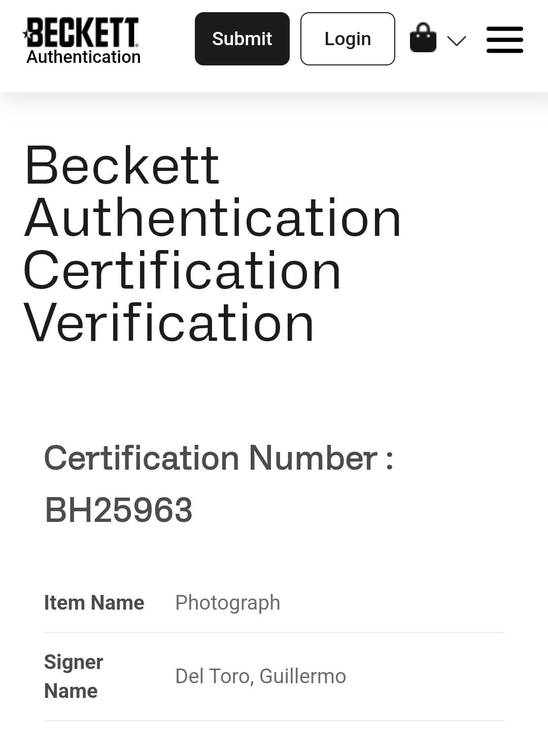 Firma certificada por una de las empresas más grandes y reconocidas de la industria Beckett Authentication Services.