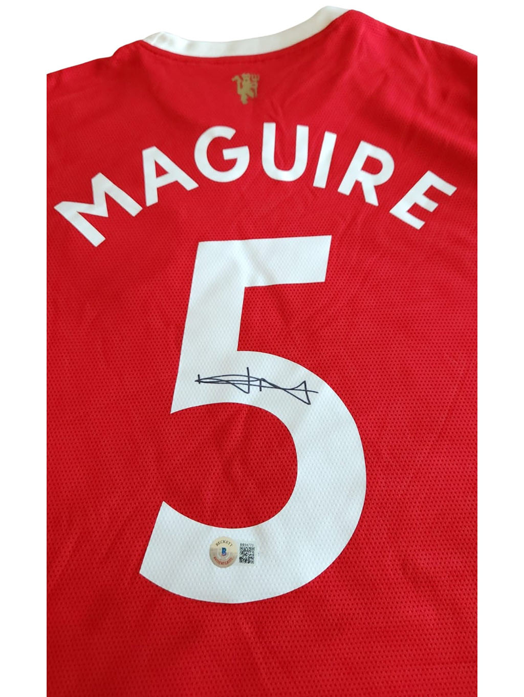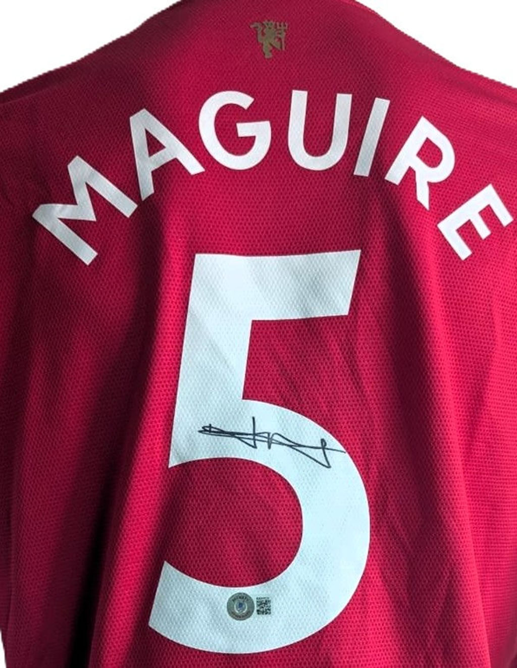 Playera autografiada por Harry Maguire firma autentificada por la compañía Beckett con el número BB94779.