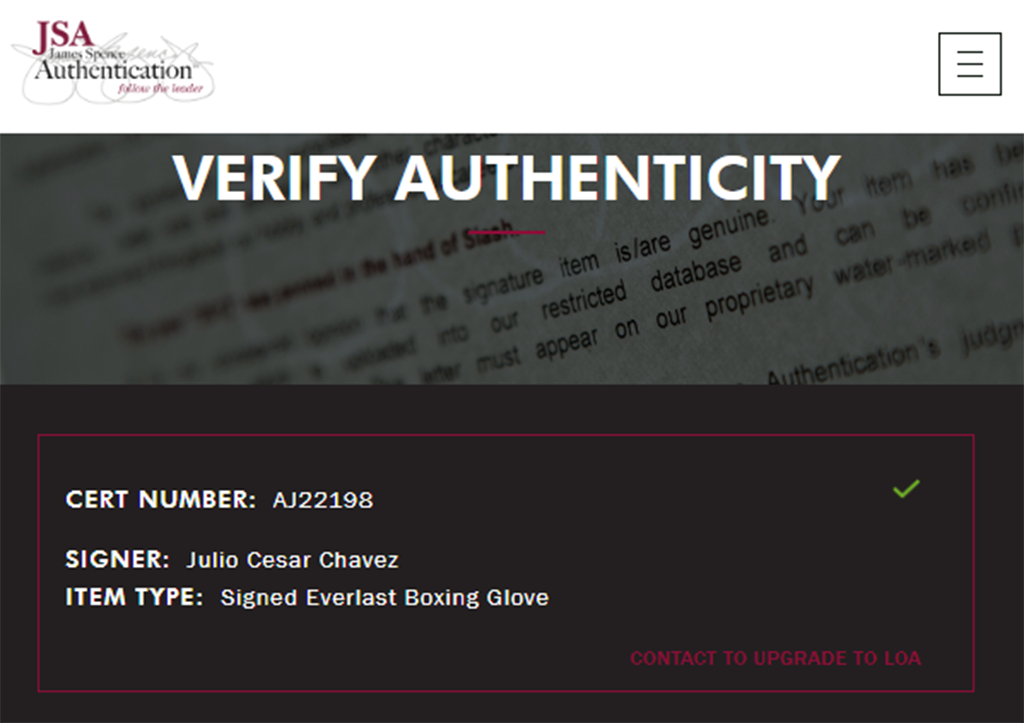 Julio Cesar Chávez Guante autografiado firma autentificada por la compañía JSA con el número AJ22198.