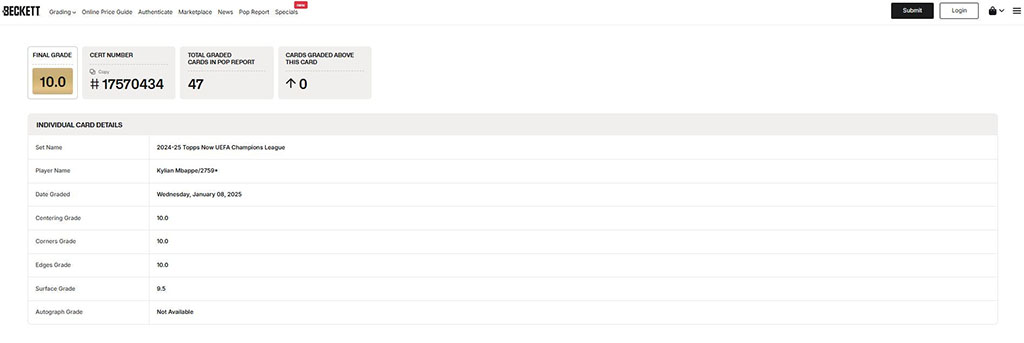 Kylian Mbappe Tarjeta Real Madrid 2024-25 Graduada por Beckett 0017570434.