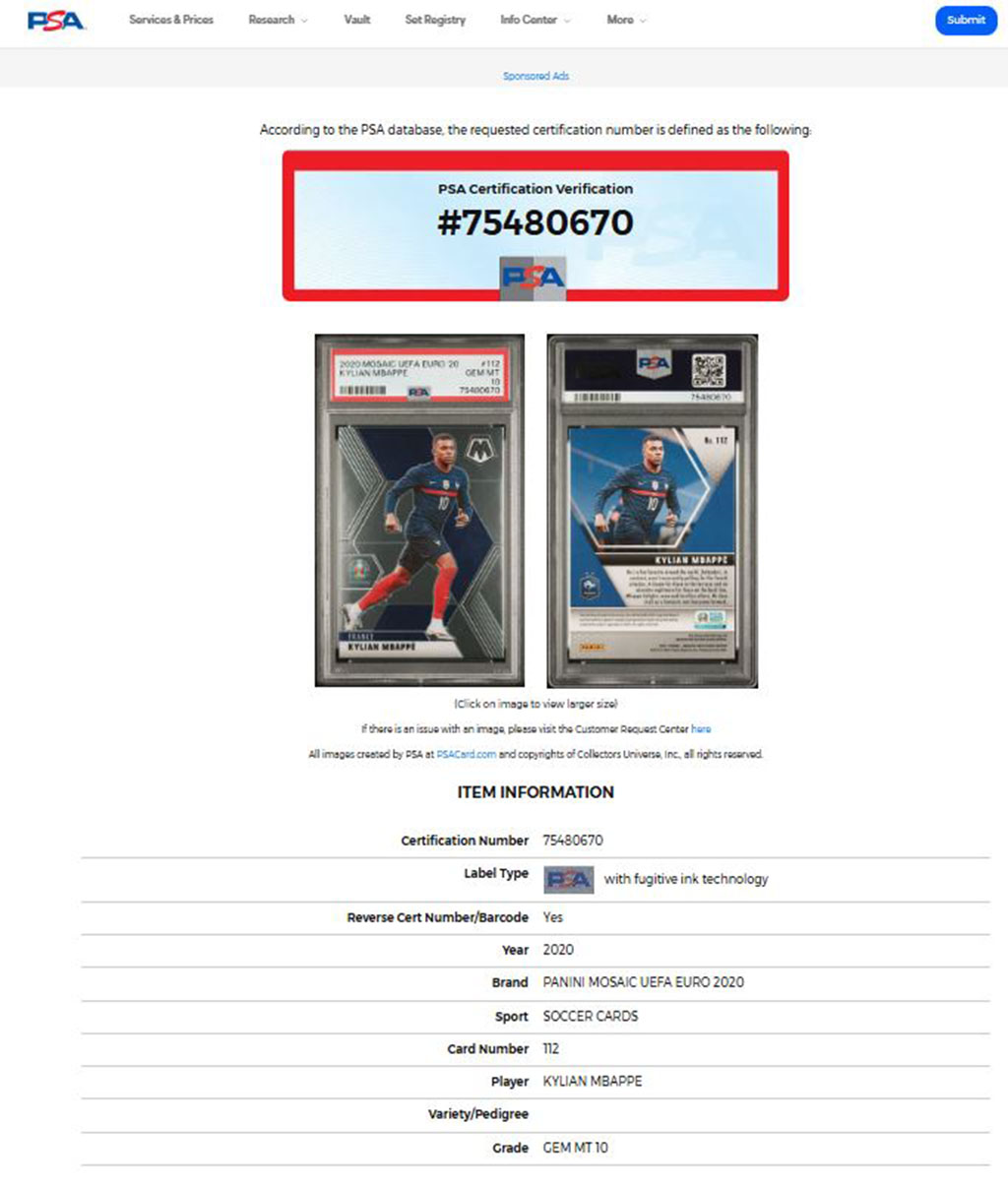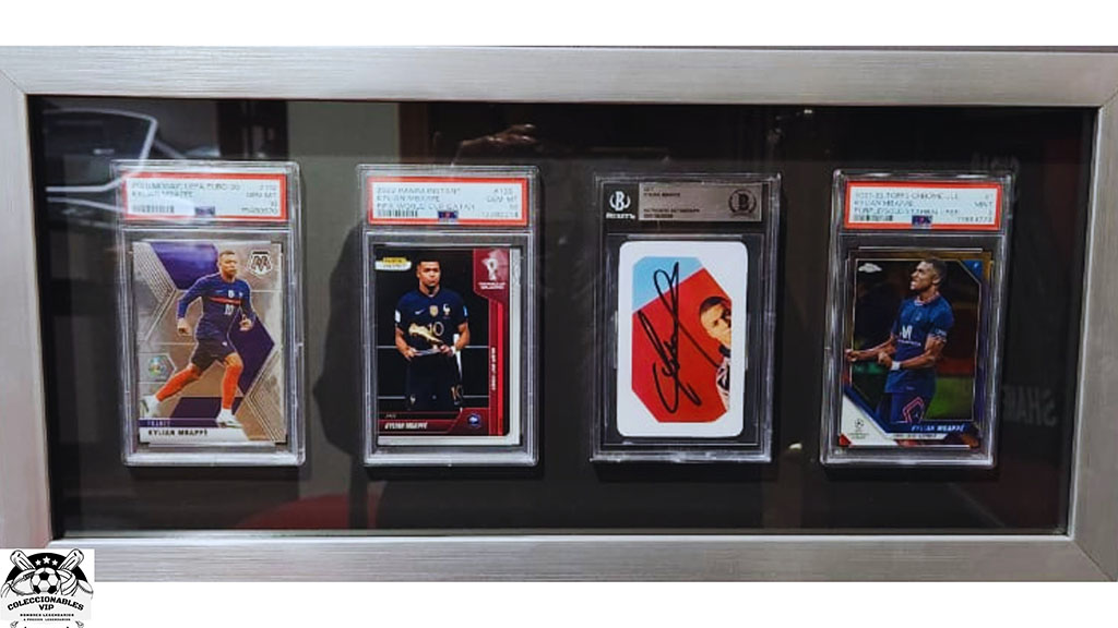 Kylian Mbappé tarjetas enmarcadas, una de ellas autografiada, firma autentificada por la compañía Beckett con el número 15600089.