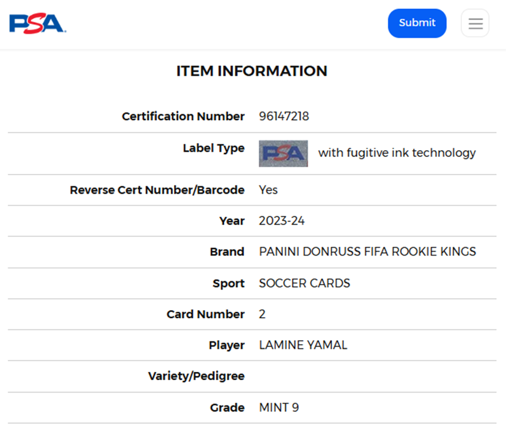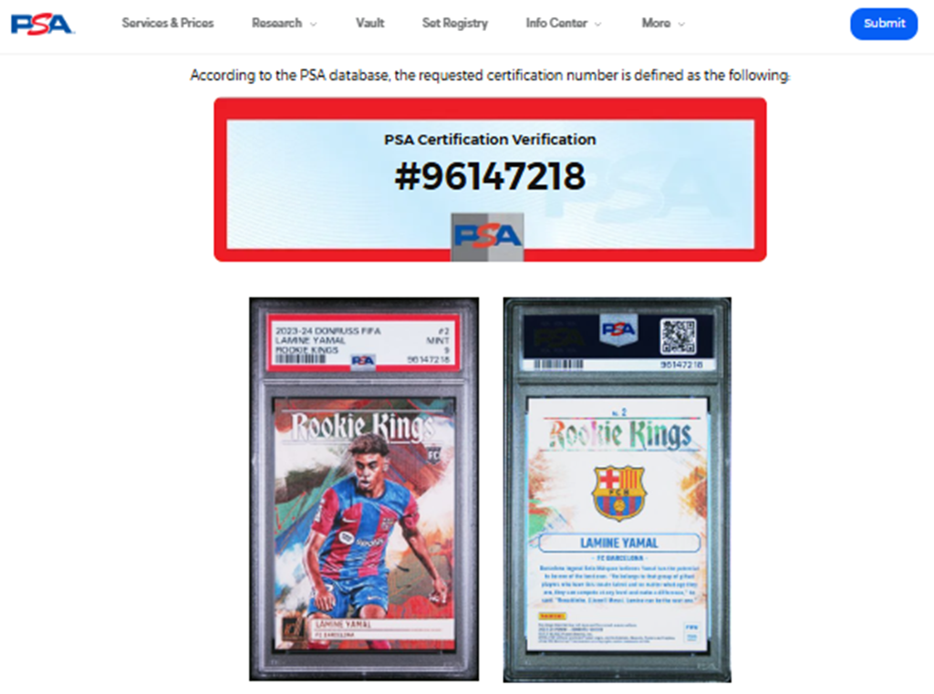 Lamine Yamal tarjeta 2023 – 2024 Donruss Fifa Rookie Kings PSA 96147218.