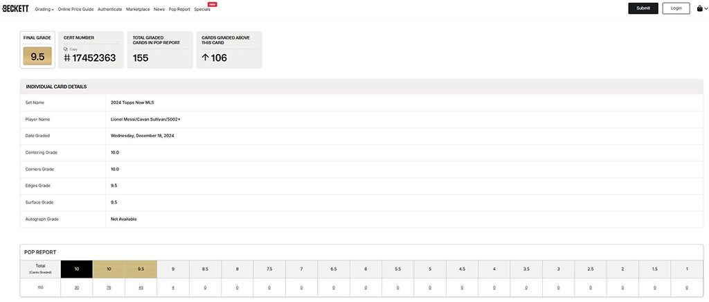 Lionel Messi y Cavan Sullivan Tarjeta Graduada por Beckett 0017452363.
