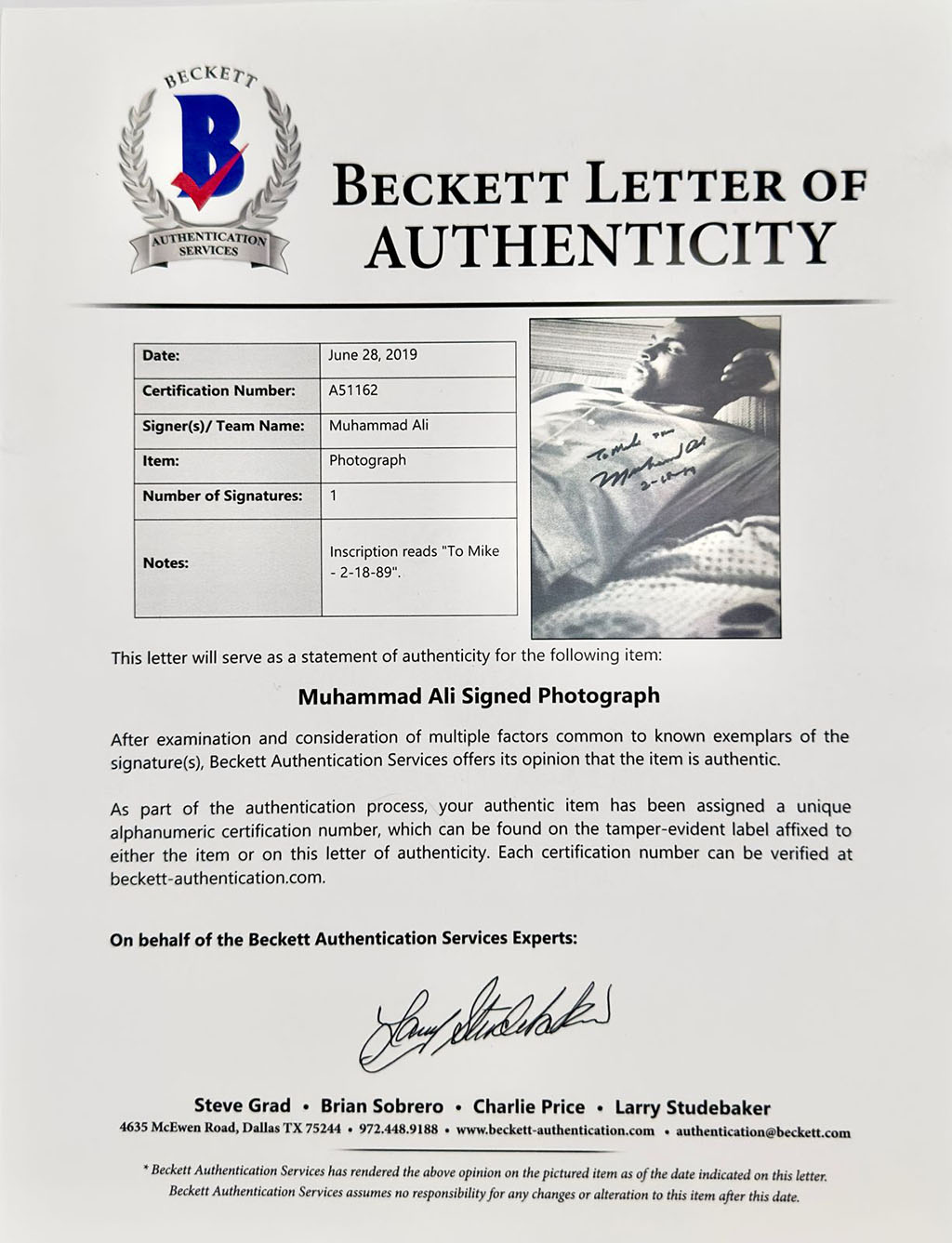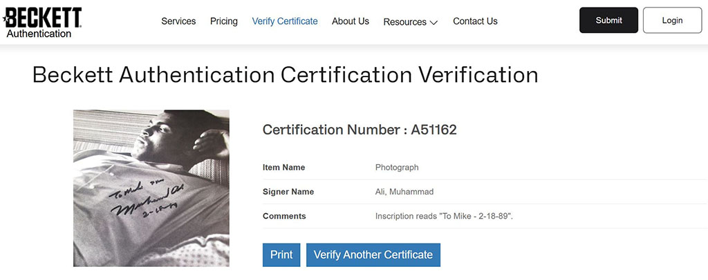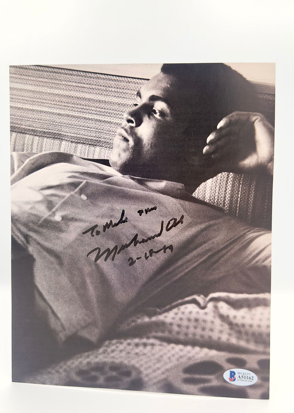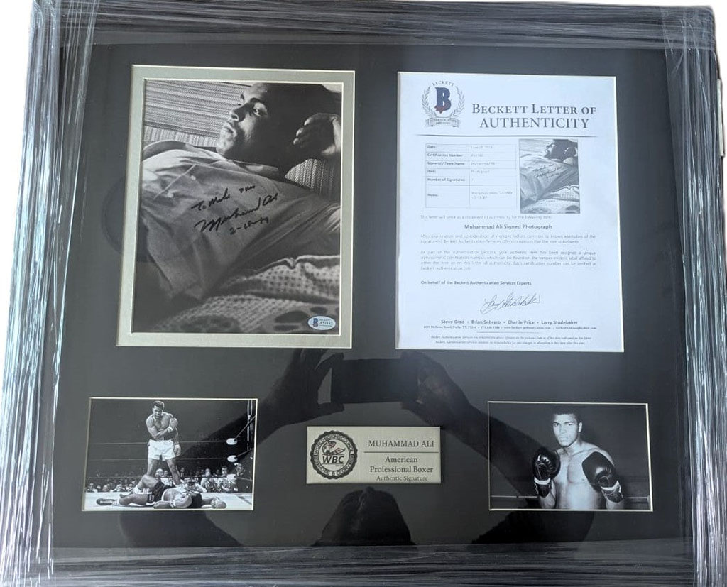 Muhammad Ali Fotografía autografiada enmarcada, firma certificada por la compañía Beckett con el número A51162, viene con carta de certificación por parte de Beckett.