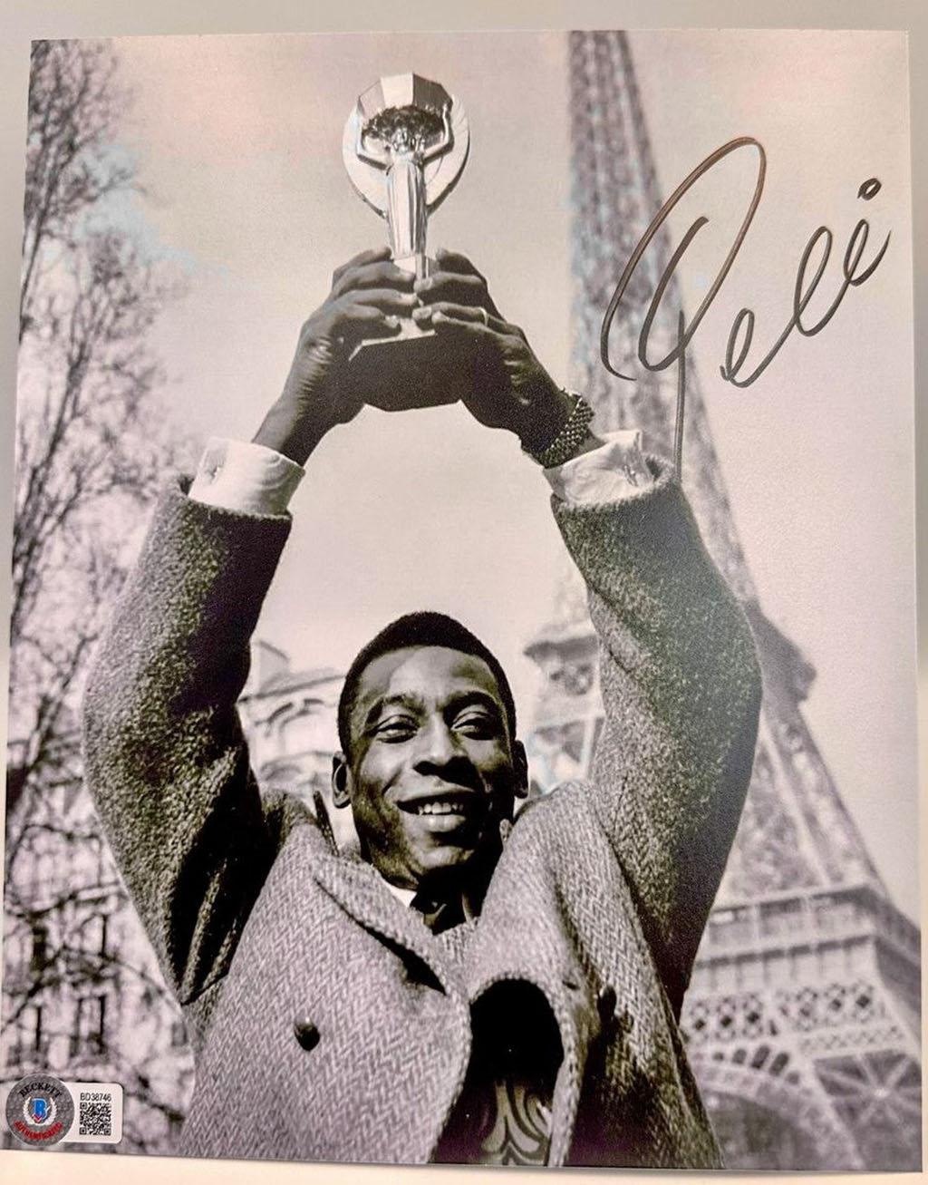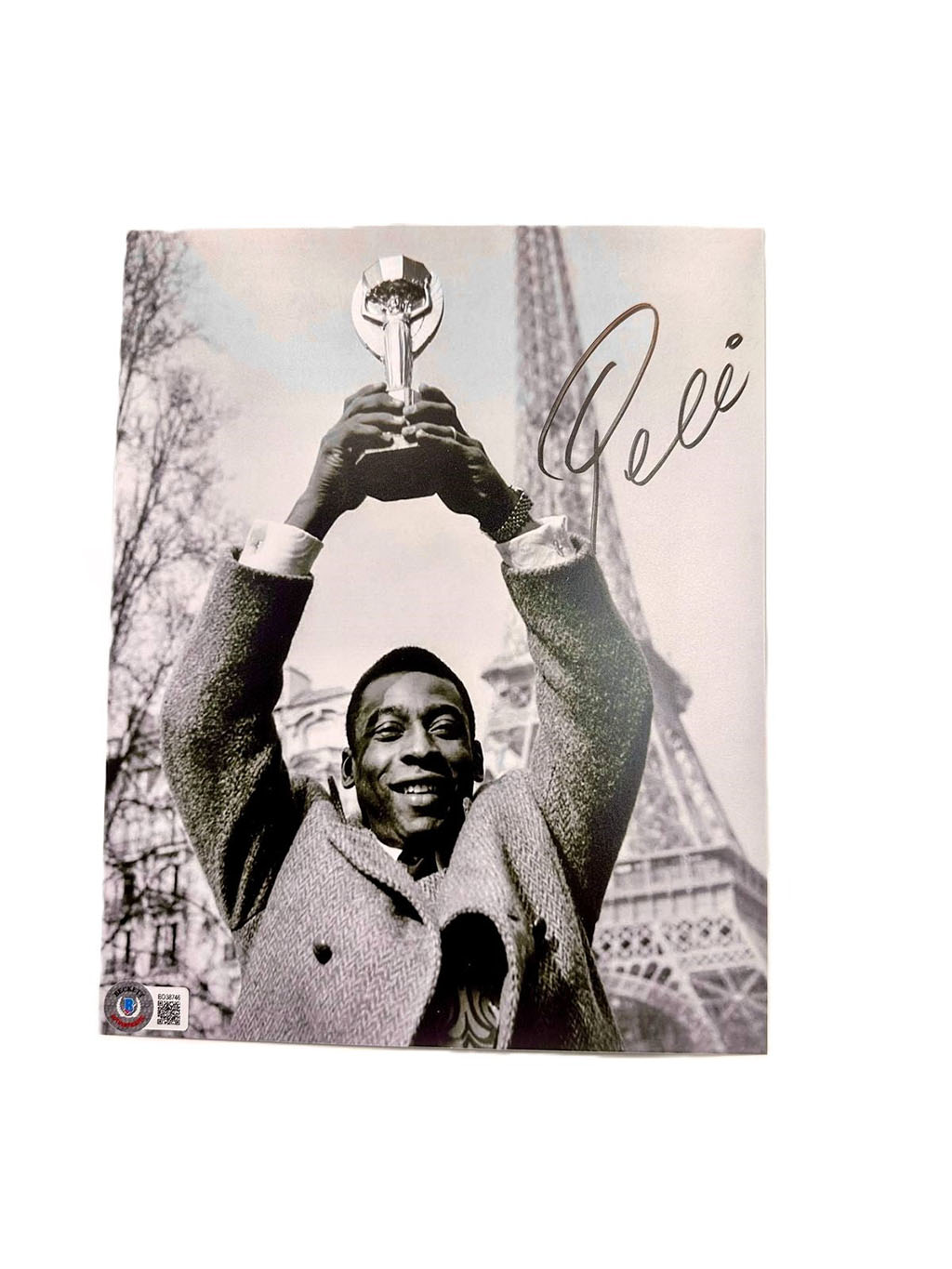 Pele Fotografía autografiada “Copa en París”, firma certificada por la compañía Beckett con el número BD38746.