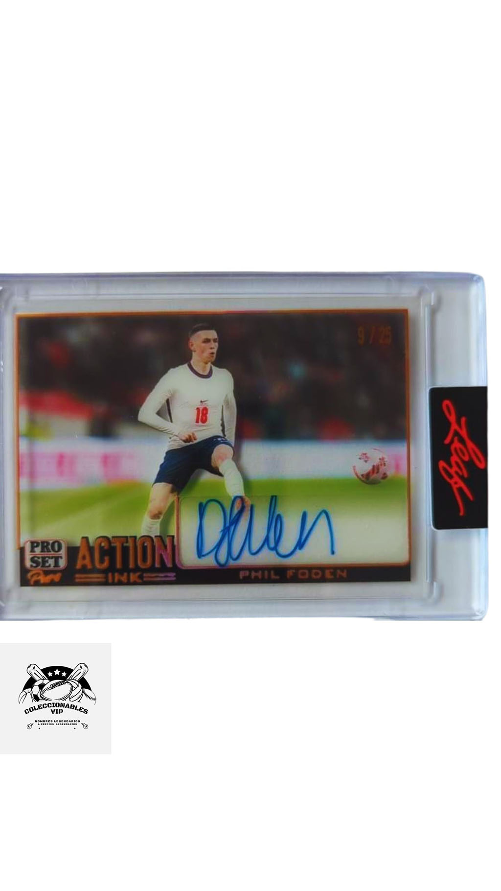 Tarjeta 9/25 Leaf Action Ink en el frente encontrarás autógrafo de Phil Foden.