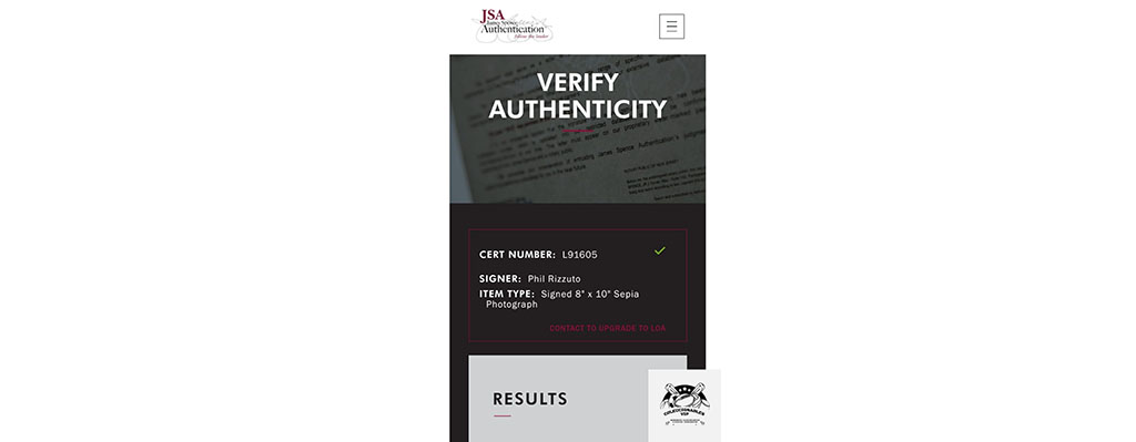 Phil Rizzuto fotografía autografiada, con certificado de autenticidad de JSA L91605.