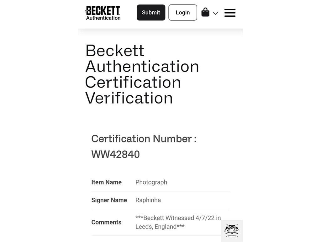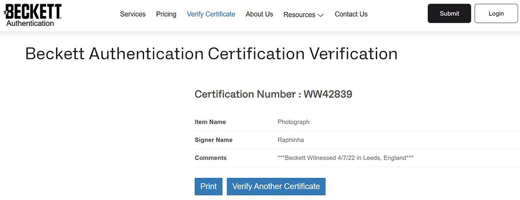 Firma certificada por una de las empresas más grandes y reconocidas de la industria Beckett Authentication Services.