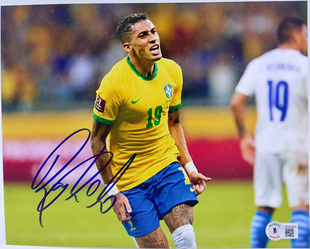 Raphinha Fotografía Brasil autografiada firma certificada por Beckett WW42839 y WW42840