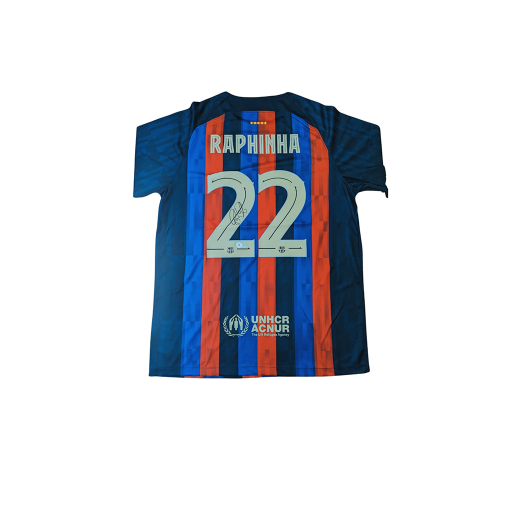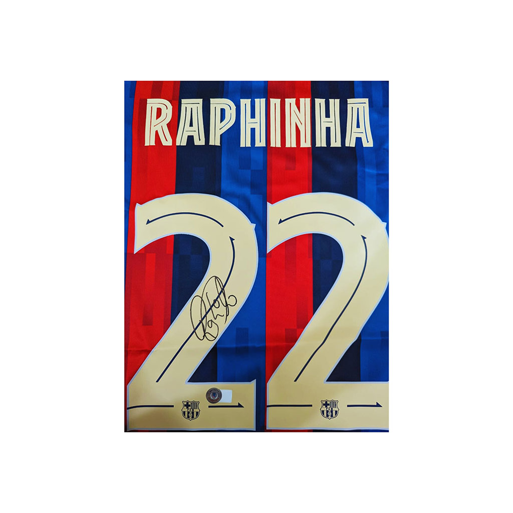 Playera autografiada por Raphinha firma autentificada por la compañía Beckett con el número BH062196.