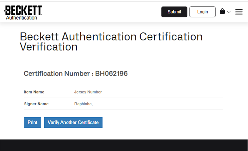 Firma certificada por una de las empresas más grandes y reconocidas de la industria Beckett Authentication Services.