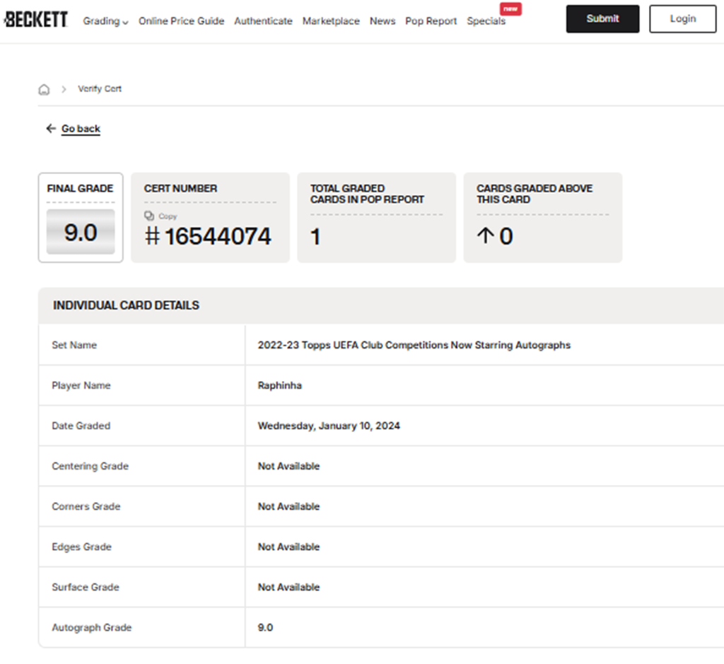 Firma certificada por una de las empresas más grandes y reconocidas de la industria Beckett Authentication Services.