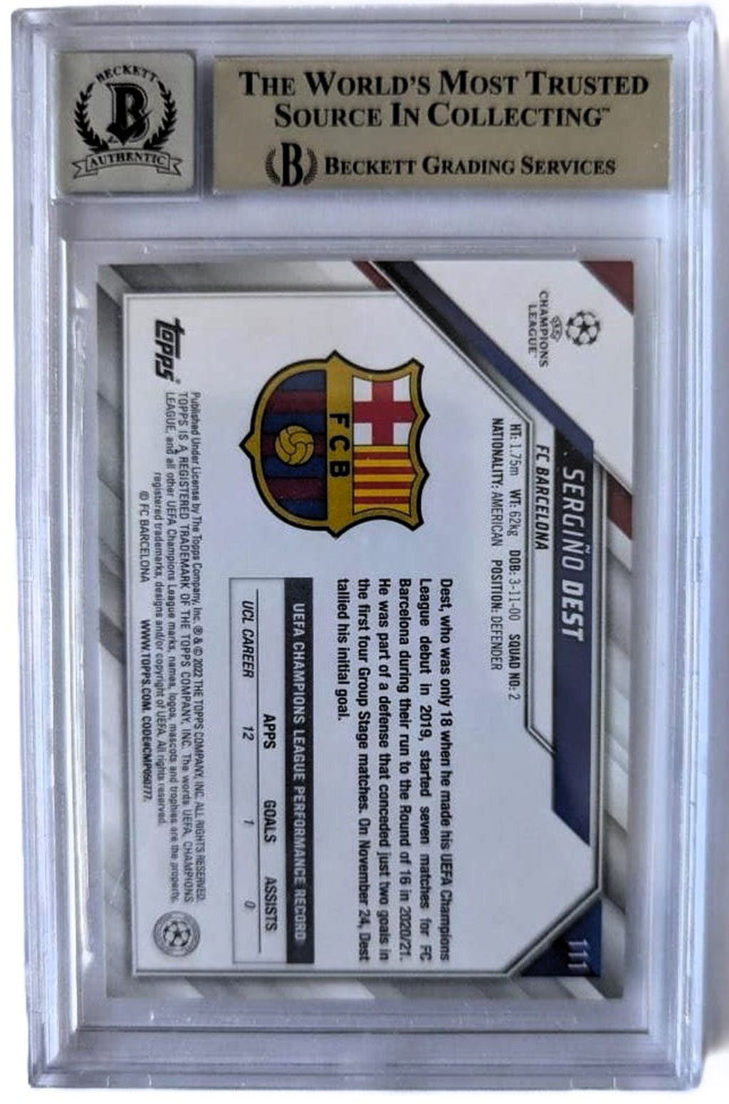 Sergiño Dest Tarjeta 2021 Autografiada Topps UCL Barcelona Certificada por Beckett 00014625097.