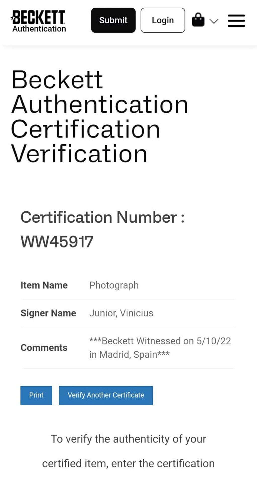 Artículo 100% original autenticado por una de las mejores empresas autenticadoras del mundo Beckett, la autenticidad se puede corroborar directamente en la página web de Beckett.
