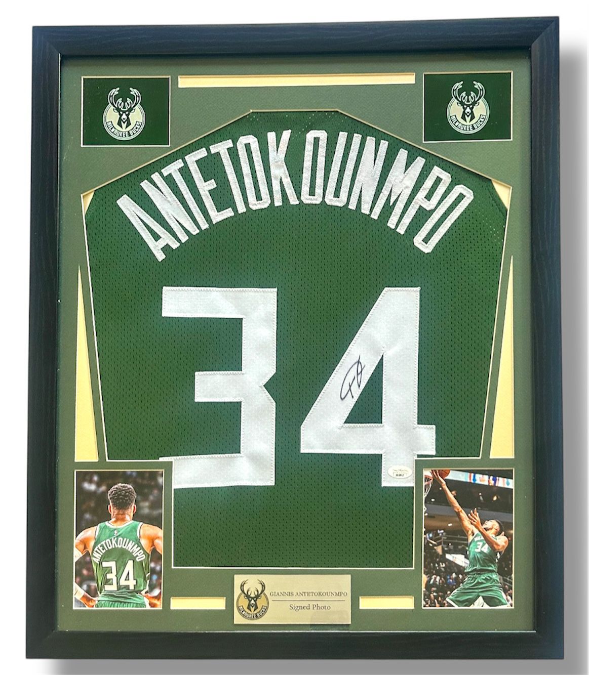 Giannis Antetokounmpo Playera Autografiada Milwaukee Bucks Enmarcada firma autenticada por la compañía JSA SS29027.