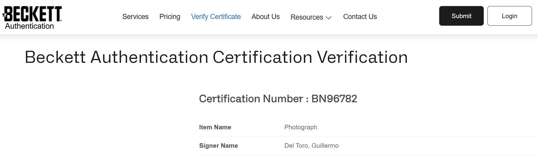 Firma certificada por una de las empresas más grandes y reconocidas de la industria Beckett Authentication Services.