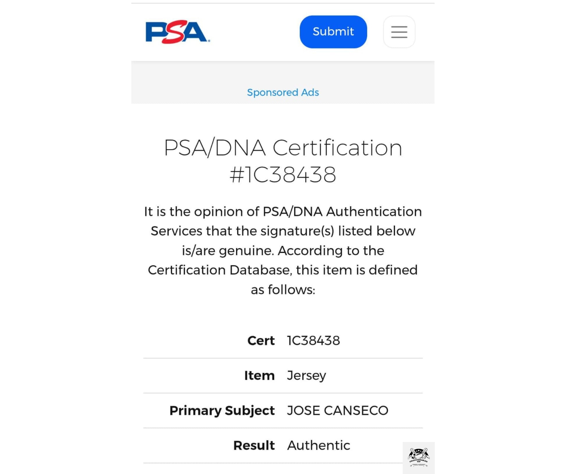 José Canseco playera autografiada certificada por PSA 1C38438.