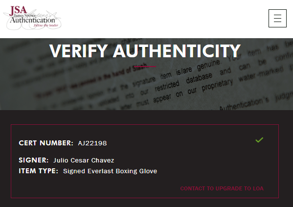 Julio Cesar Chávez Guante autografiado firma autentificada por la compañía JSA con el número AJ22198.