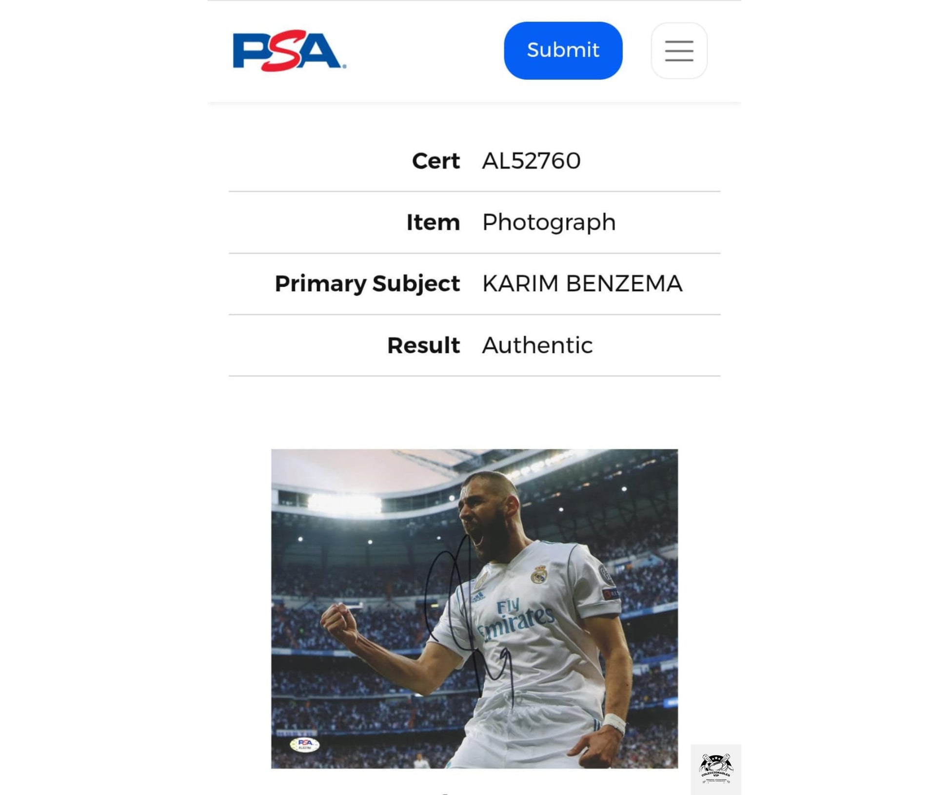 Karim Benzema Real Madrid uniforme blanco fotografía autografiada certificada por PSA AL52760.