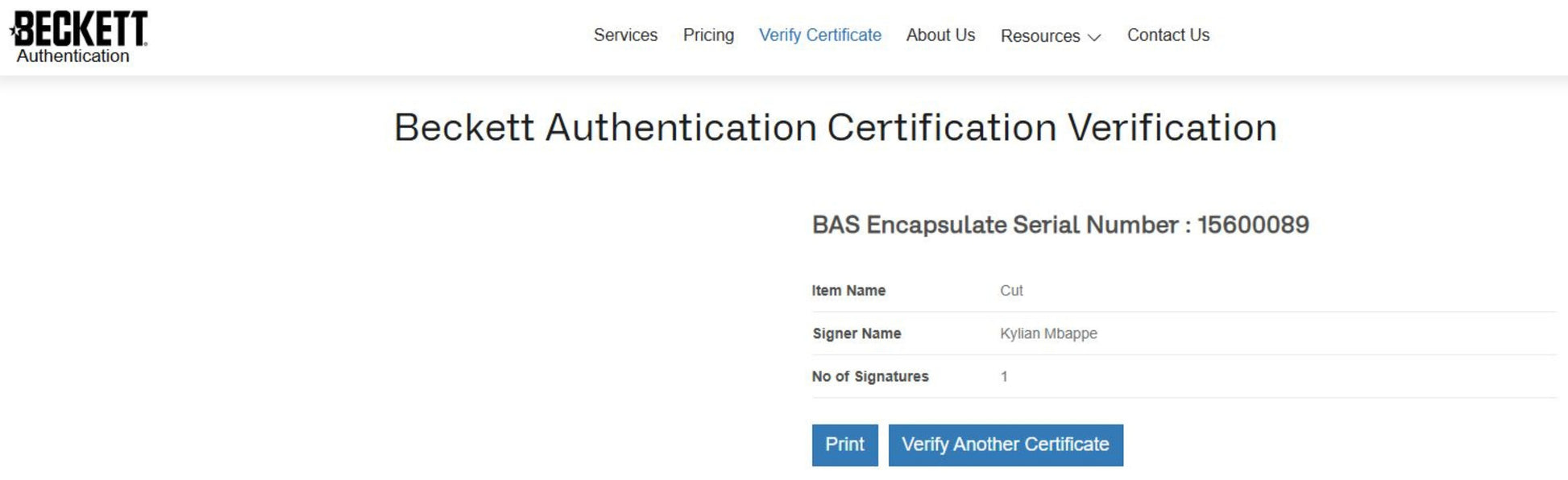 Firma certificada por una de las empresas más grandes y reconocidas de la industria Beckett Authentication Services.