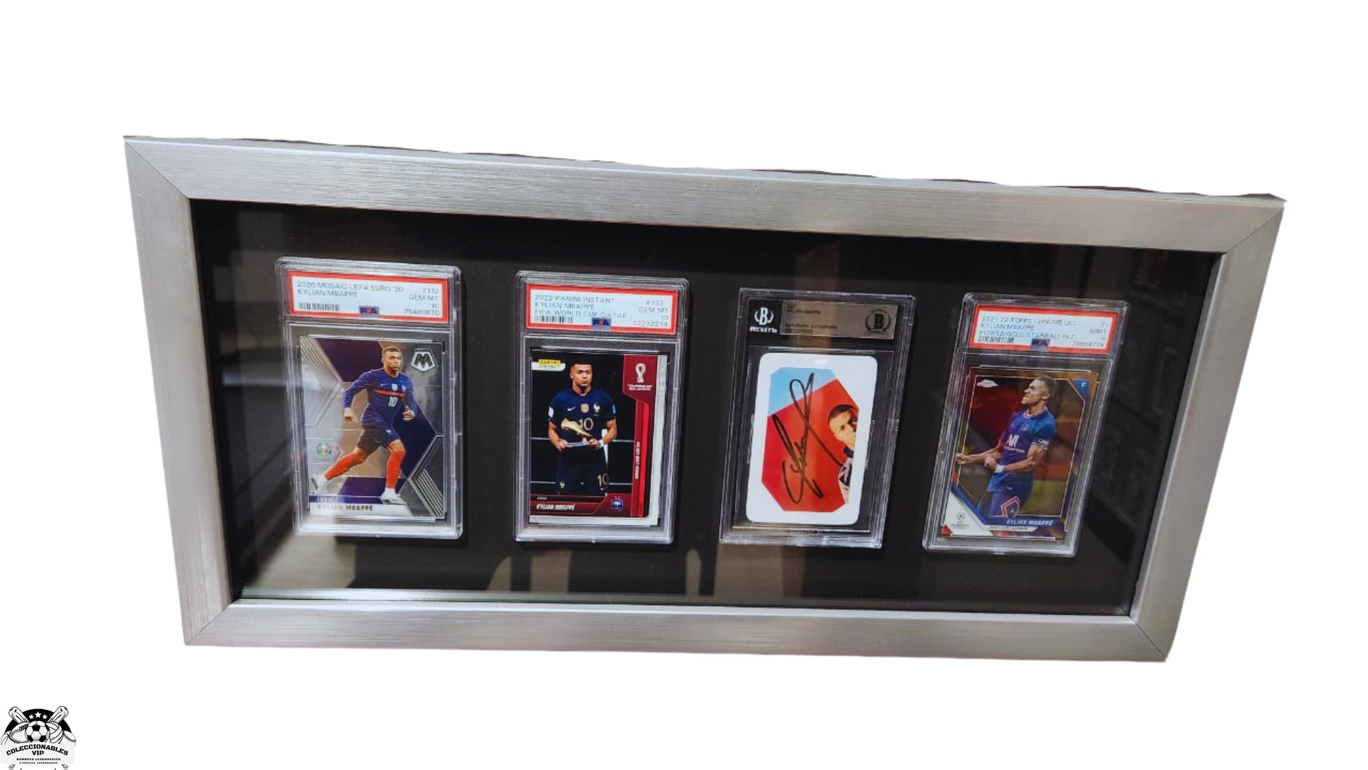 Kylian Mbappé tarjetas enmarcadas, una de ellas autografiada, firma autentificada por la compañía Beckett con el número 15600089.