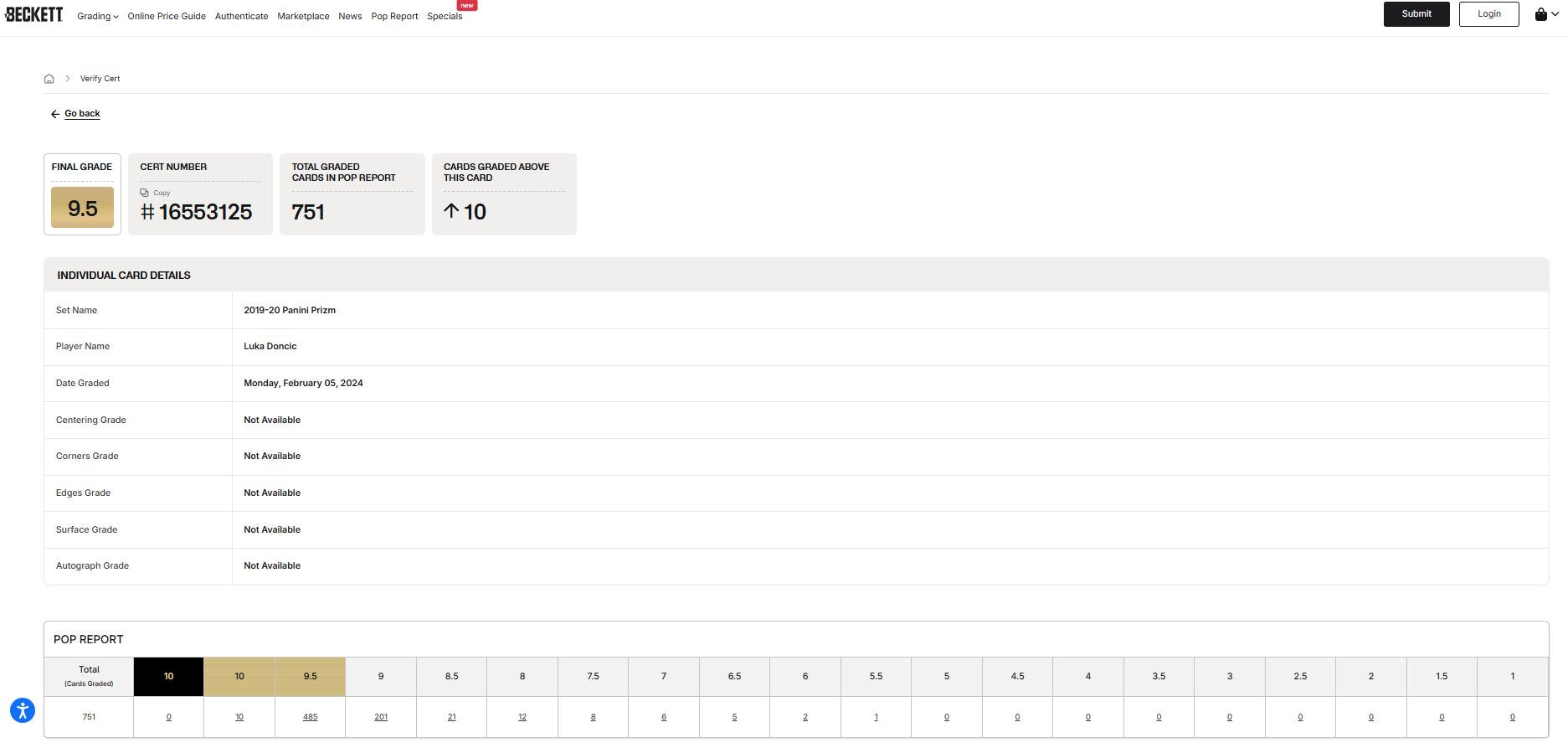 Luka Doncic Tarjeta Panini #75 Mavericks Graduada por Beckett 0016553125.