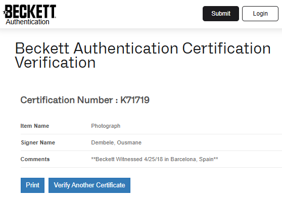 Firma certficada por una de las empresas más grandes y reconocidas de la industria Beckett Authentication Services.
