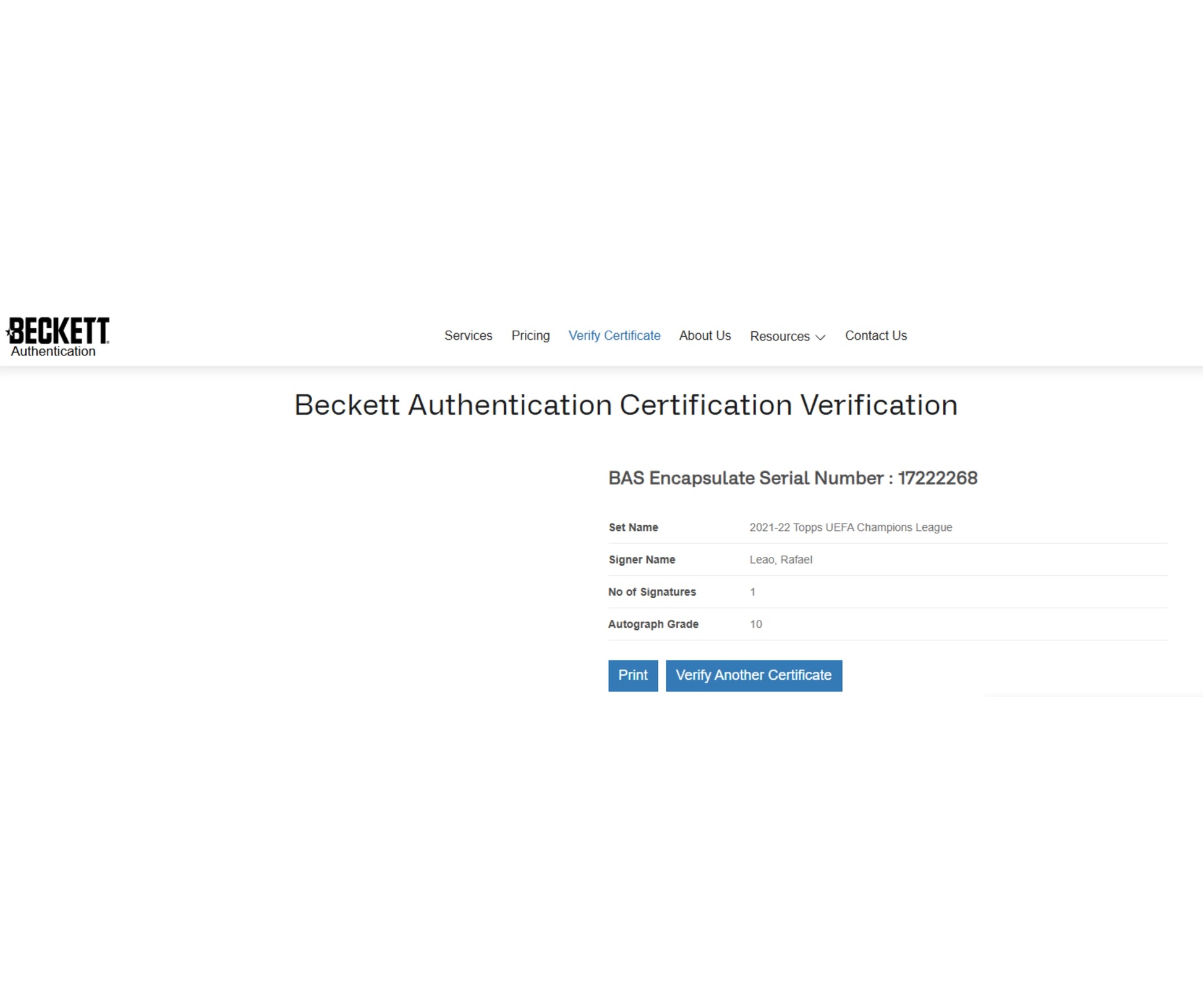 Firma cerificada por una de las empresas más grandes y reconocidas de la industria Beckett Authentication Services.