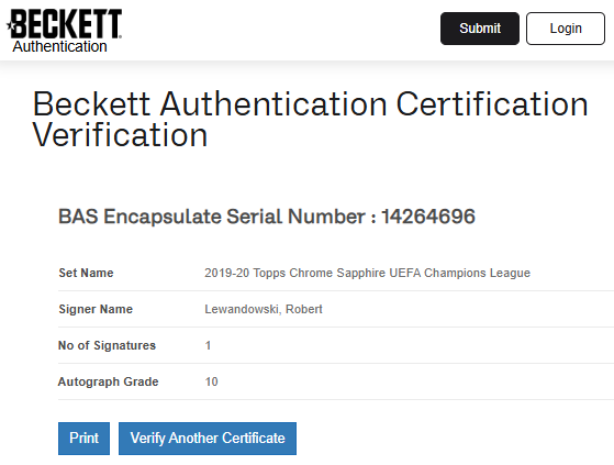 Firma certificada por una de las empresas más grandes y reconocidas de la industria Beckett Authentication Services.