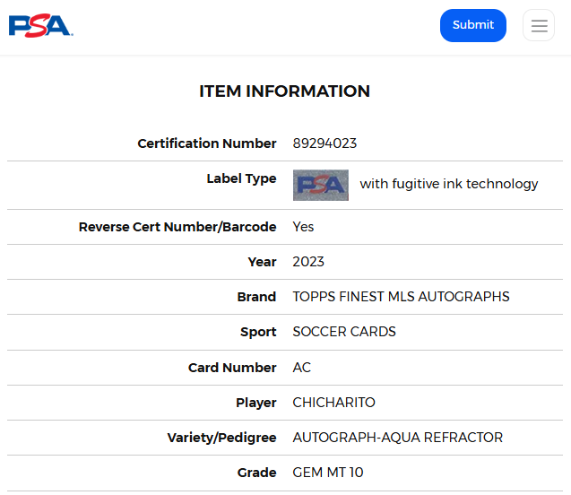 Firma certificada por PSA es la empresa de autenticación y clasificación de terceros más grande y respetada del mundo para tarjetas coleccionables y recuerdos.