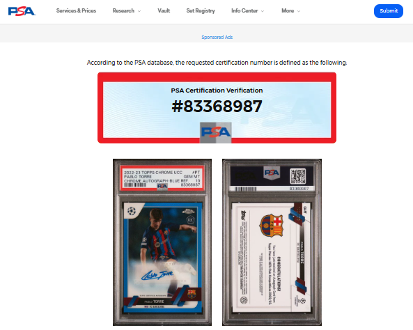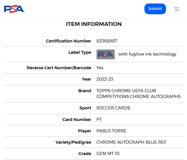 Firma certificada por PSA, empresa de autenticación y clasificación de terceros más grande y respetada del mundo para tarjetas coleccionables y recuerdos.